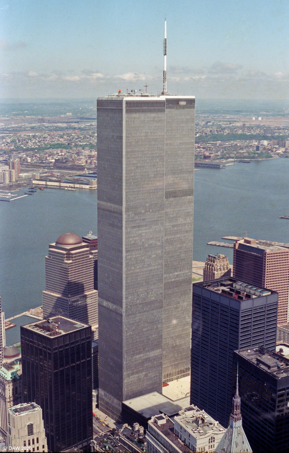 A view of the two World Trade Centre Towers taken from the air  in 1989.  The last tower was completed in 1973, not counting the Telecommunications mast they stood at 417m tall but was surpassed as the tallest building in the world by the Willis Tower (Sears Tower) in Chicago in 1973.