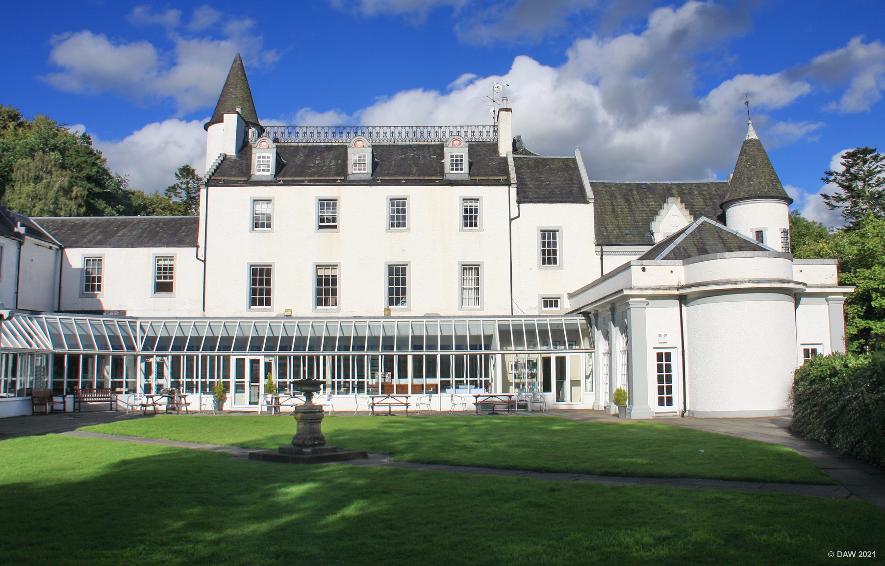 The house you see today was built around an existing 16th century Tower House. Today it is operated as The Barony Castle Hotel. During the second World War it was requisitioned for military use and became a school for training Polish staff officer training. This link to Poland is what it is famous for today since in its grounds it hosts The Great Polish Map of Scotland.